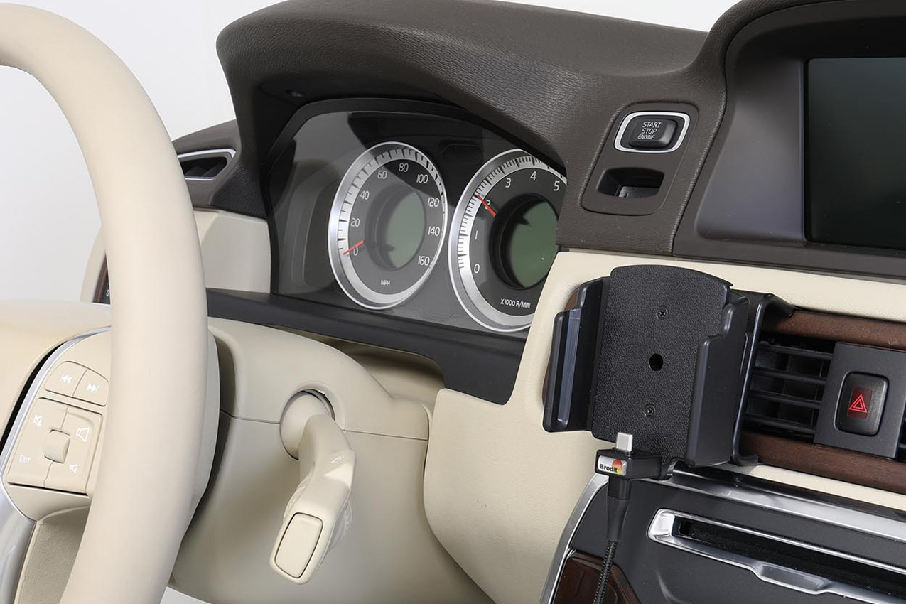 Die Halteschale sitzt auf einem Kugelgelenksockel der frei um 360° drehbar und in jede Richtung um 17° neigbar ist, um den Blickwinkel optimal einstellen zu können. Zur Befestigung liegen vier Schrauben bei. Optimalerweise wird die Halterung auf einem fahrzeugspezifischen Brodit ProClip angebracht. Grundsätzlich kann die Halterung aber auch auf anderen ebenen Flächen befestigt werden.