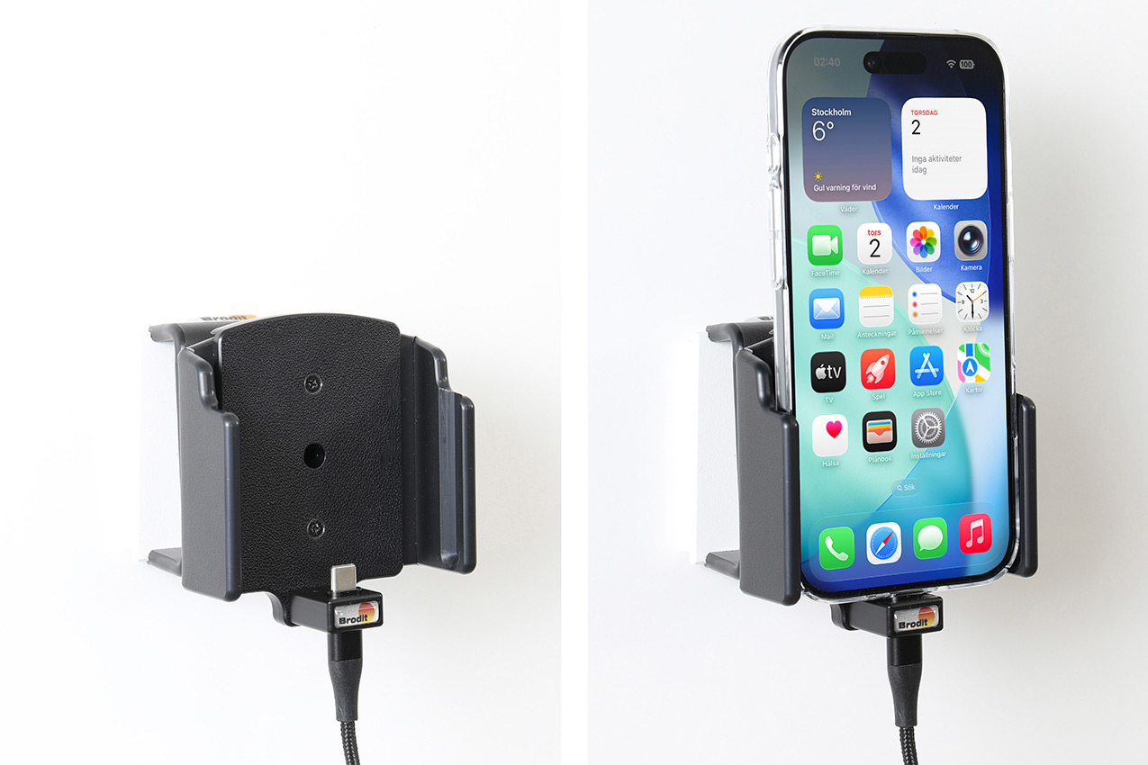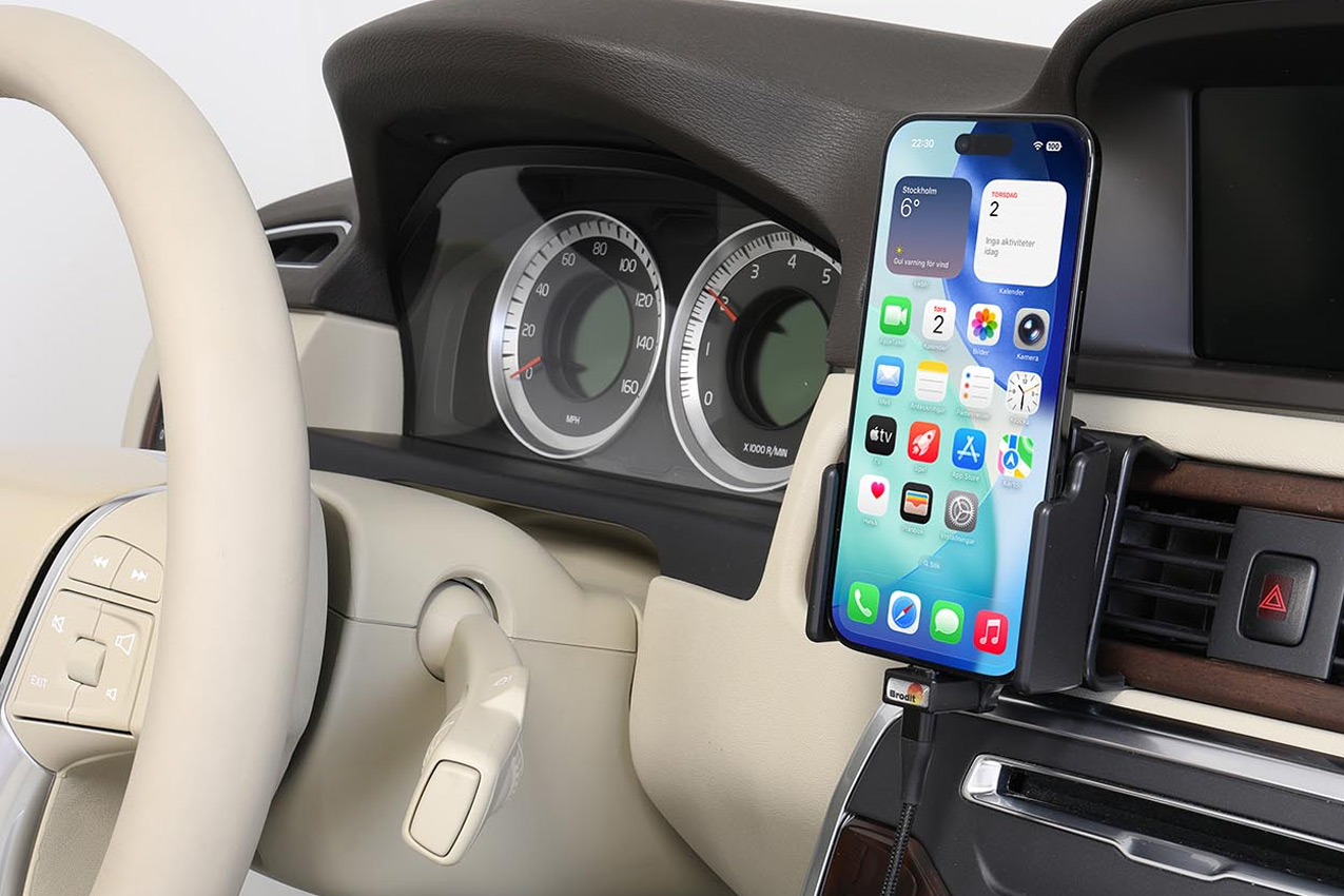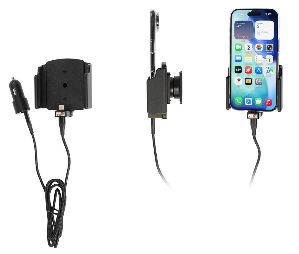 Einstellbare aktive Brodit KFZ-Halterung für Apple iPhone Air mit integriertem USB-Kabel und KFZ-Adapter. Verfügt das Fahrzeug über einen USB-Anschluss, kann die Halterung direkt damit verbunden werden. Alternativ kann über den mitgelieferten KFZ-Adapter ein Anschluss an eine 12V- oder 24V-Buchse im Fahrzeug erfolgen. Die Bedienelemente des iPhone bleiben im Halter frei zugänglich.