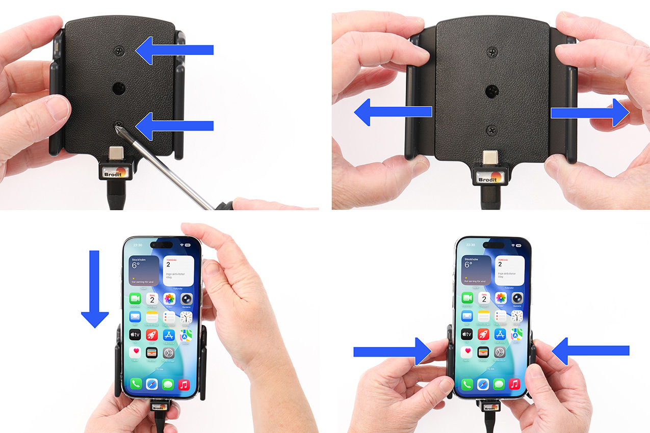 Einstellung des Halters: Lösen Sie die beiden von vorne zugänglichen Schrauben ein wenig mit einem Kreuzschraubendreher, bis die seitlichen Haltebacken der Halterung bewegt werden können. Stellen Sie die Breite der Halterung auf Ihre Gerätebreite ein. Ziehen Sie dann die beiden Schrauben wieder fest.